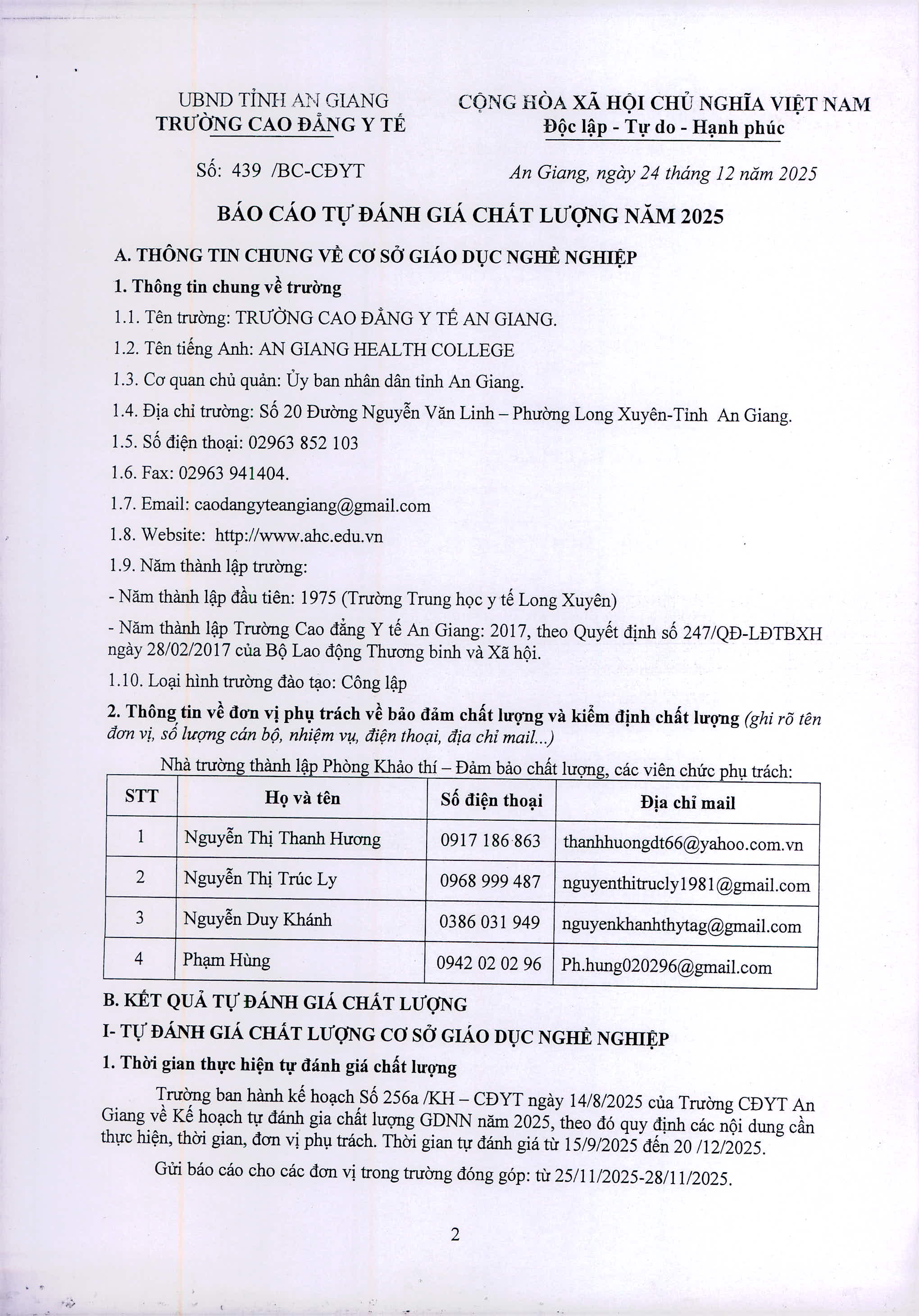 Báo cáo tự đánh giá năm 2025 của Trường Cao đẳng Y tế An Giang 08:43 27/12/2025 | 5 lượt xem Chia sẻ:Bài viết mới nhất Thông báo chiêu sinh lớp Điều dưỡng chuyên khoa mắt Kế hoạch mở các lớp đào tạo liên tục, đào tạo thường xuyên, sơ cấp Lịch thi học kỳ, Danh sách thi lại, học lại Quyết định Về việc phê duyệt kế hoạch lựa chọn nhà thầu gói thầu: Cải tạo nâng nền nhà xe sinh viên và sân cầu lông Quyết định Về việc Phê duyệt kết quả chỉ định thầu gói thầu: Cải tạo nâng nền nhà xe sinh viên và sân cầu lông