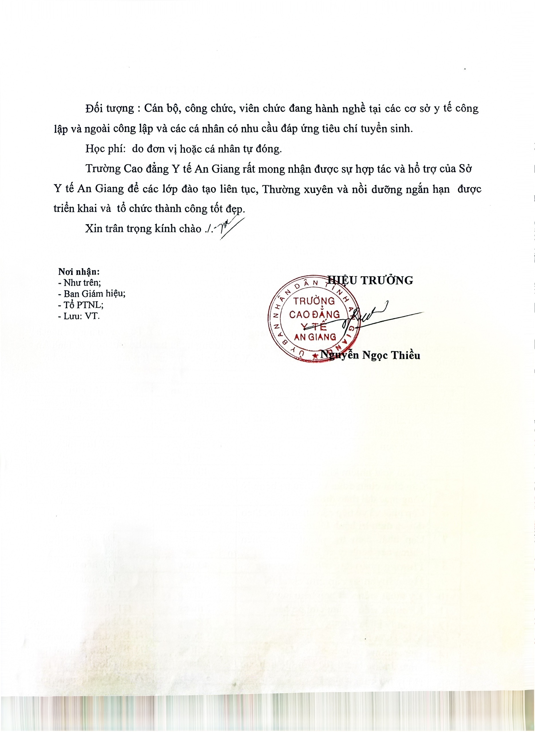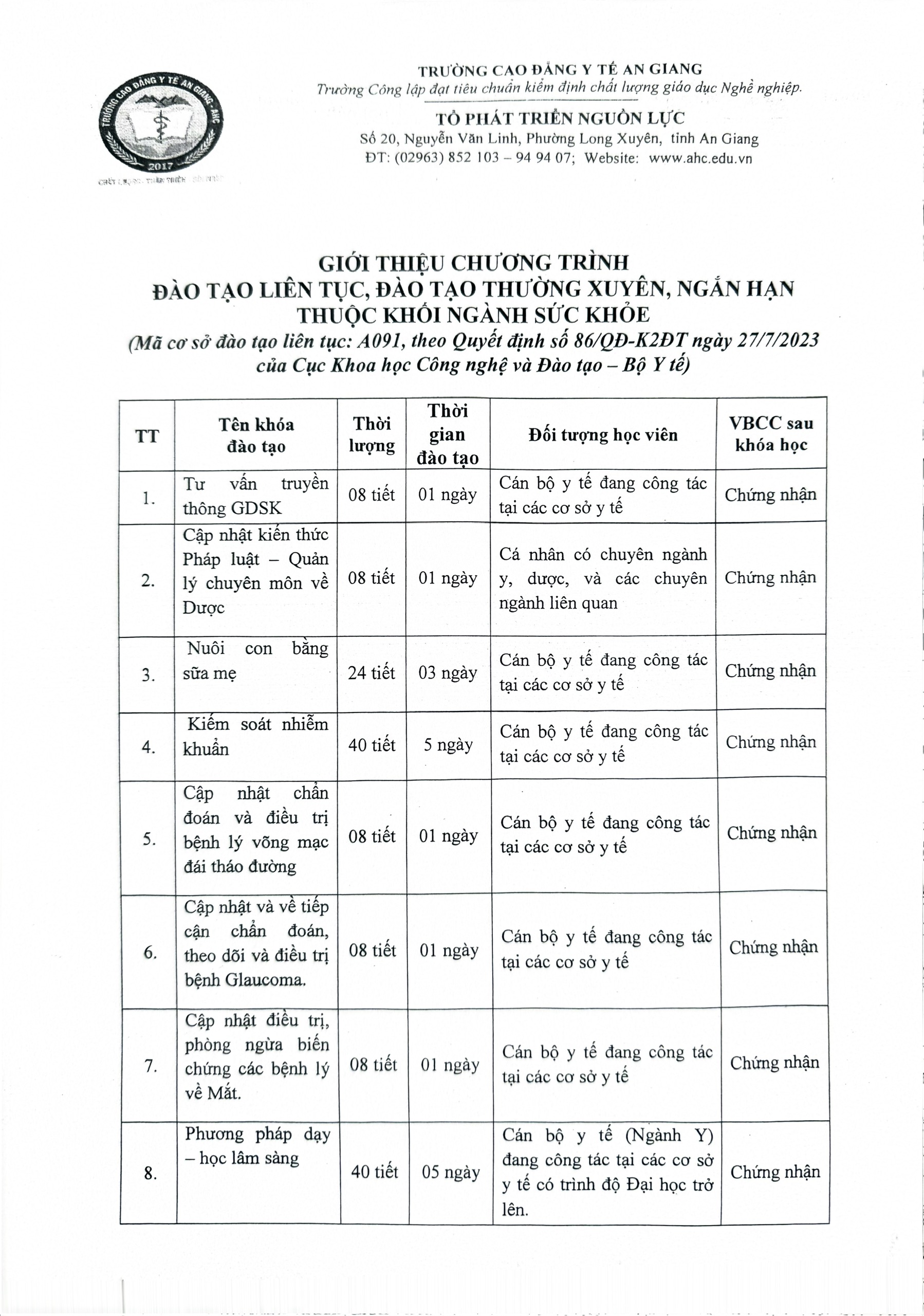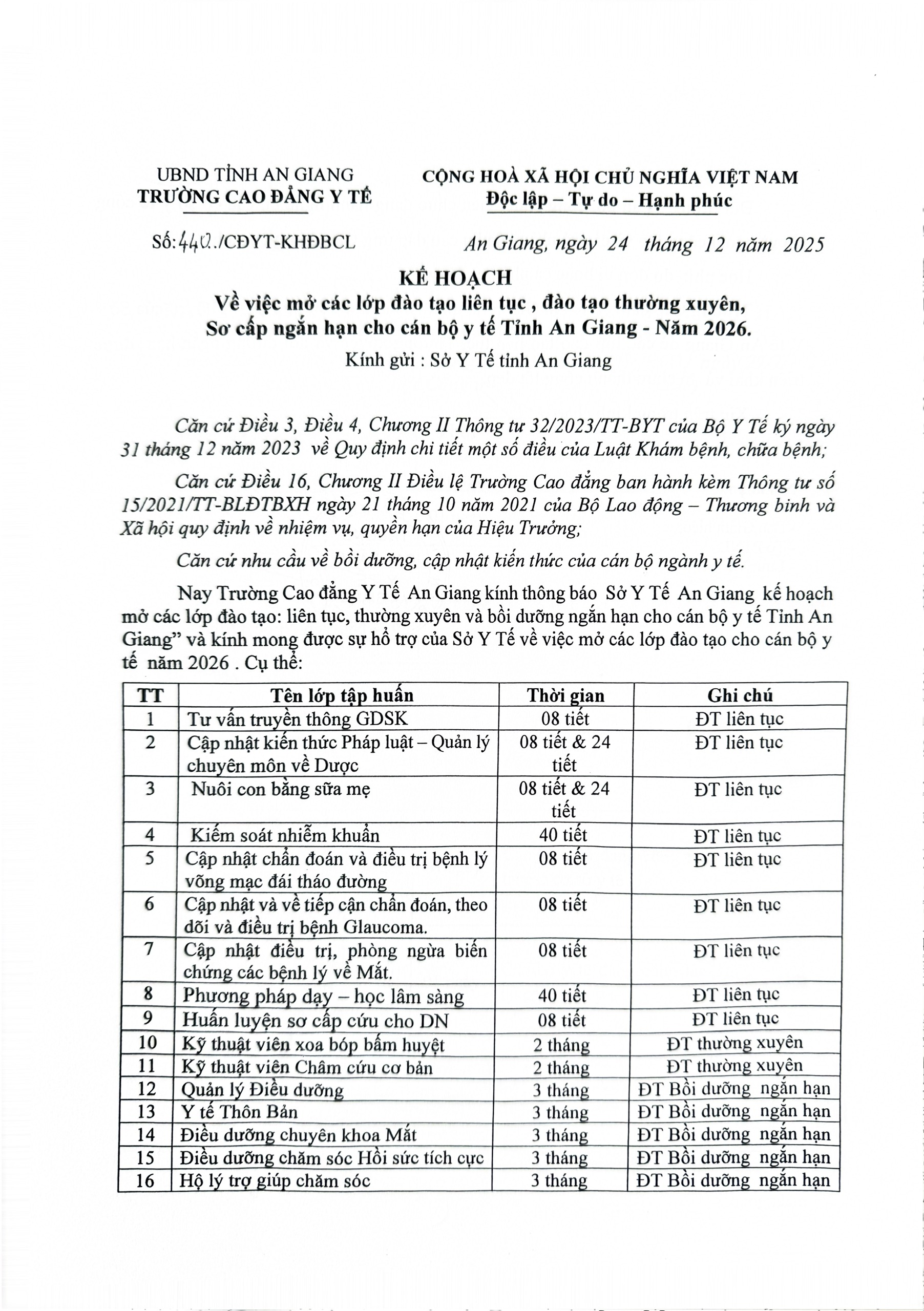 Kế hoạch mở các lớp đào tạo liên tục, đào tạo thường xuyên, sơ cấp 16:37 26/12/2025 | 1 lượt xemKế hoạch mở các lớp đào tạo liên tục, đào tạo thường xuyên, sơ cấpChia sẻ:Bài viết mới nhất Thông báo chiêu sinh lớp Điều dưỡng chuyên khoa mắt Lịch thi học kỳ, Danh sách thi lại, học lại Quyết định Về việc phê duyệt kế hoạch lựa chọn nhà thầu gói thầu: Cải tạo nâng nền nhà xe sinh viên và sân cầu lông Quyết định Về việc Phê duyệt kết quả chỉ định thầu gói thầu: Cải tạo nâng nền nhà xe sinh viên và sân cầu lông Quyết định phê duyệt kết quả chỉ định thầu gói thầu giảng dạy giáo dục quốc phòng và an ninh NH 2025 – 2026