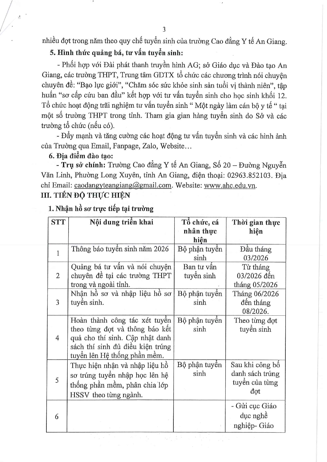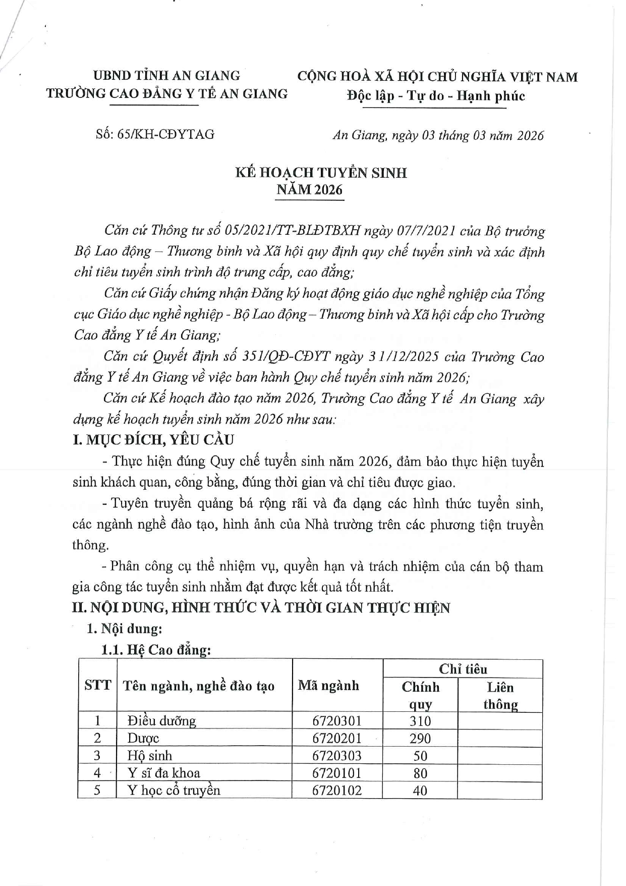 Kế hoạch tuyển sinh năm 2026 08:57 05/03/2026 | 44 lượt xemKế hoạch tuyển sinh năm 2026Chia sẻ:Bài viết mới nhất TRƯỜNG CAO ĐẲNG Y TẾ AN GIANG Ban Giám hiệu Trường Cao đẳng Y tế An Giang chúc mừng Xuân Bính Ngọ năm 2026 THÔNG BÁO về việc tổ chức xét thăng hạng chức danh nghề nghiệp viên chức từ hạng III lên hạng II và từ hạng IV lên hạng III của Trường Cao đẳng Y tế An Giang năm 2025 Lịch thi HK1 năm học 2025-2026 các lớp Chính quy Thông báo chiêu sinh lớp Điều dưỡng chuyên khoa mắt