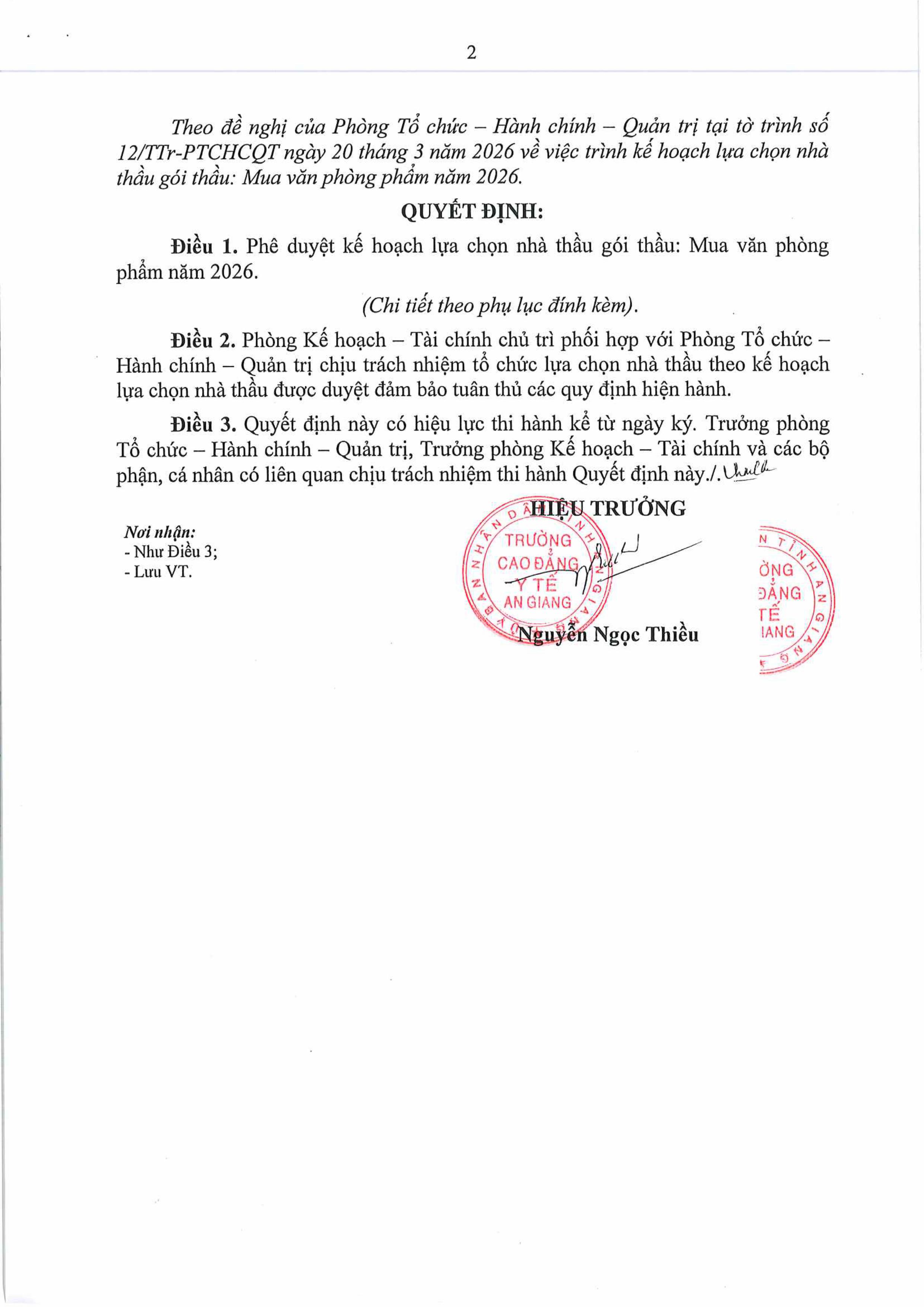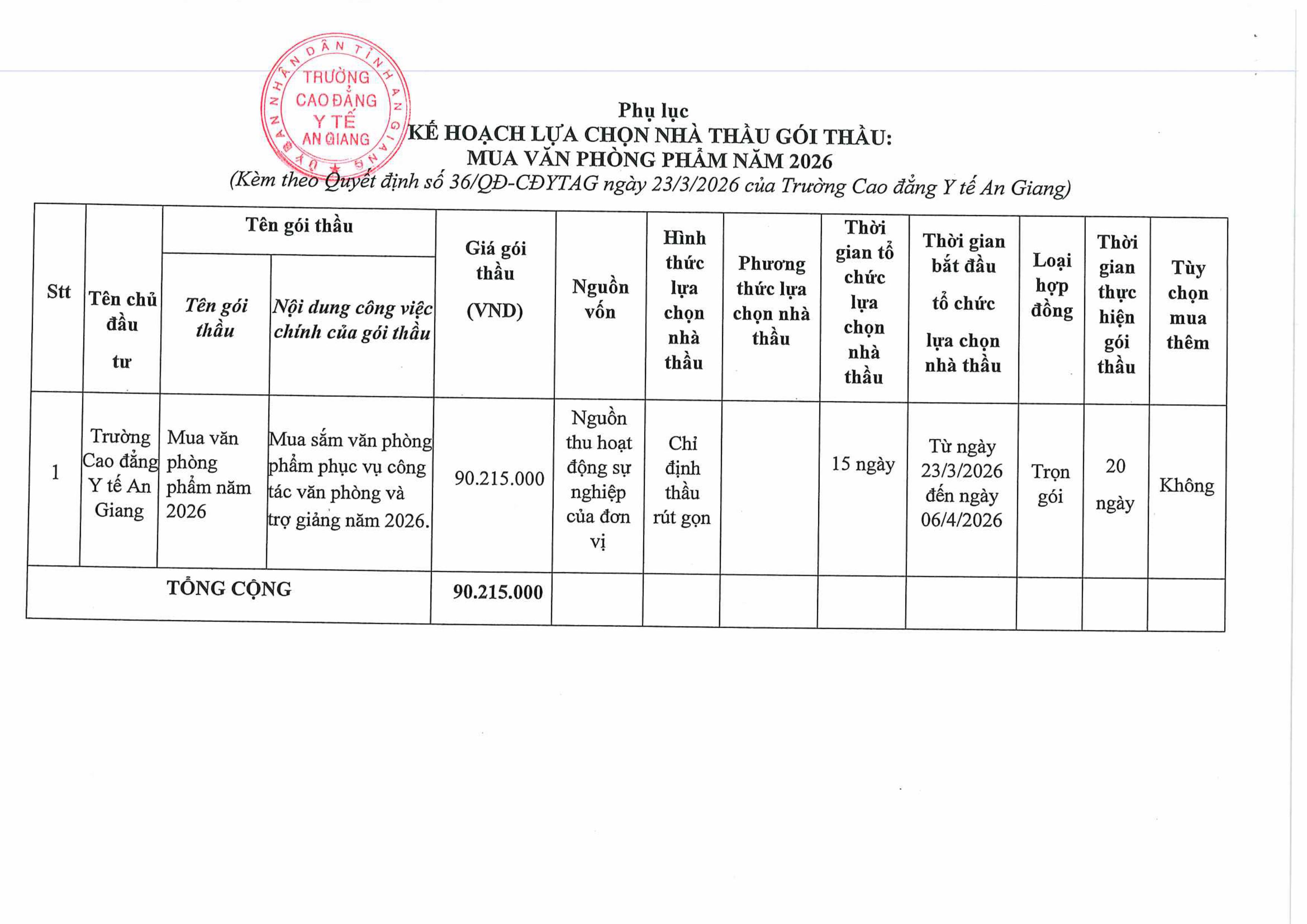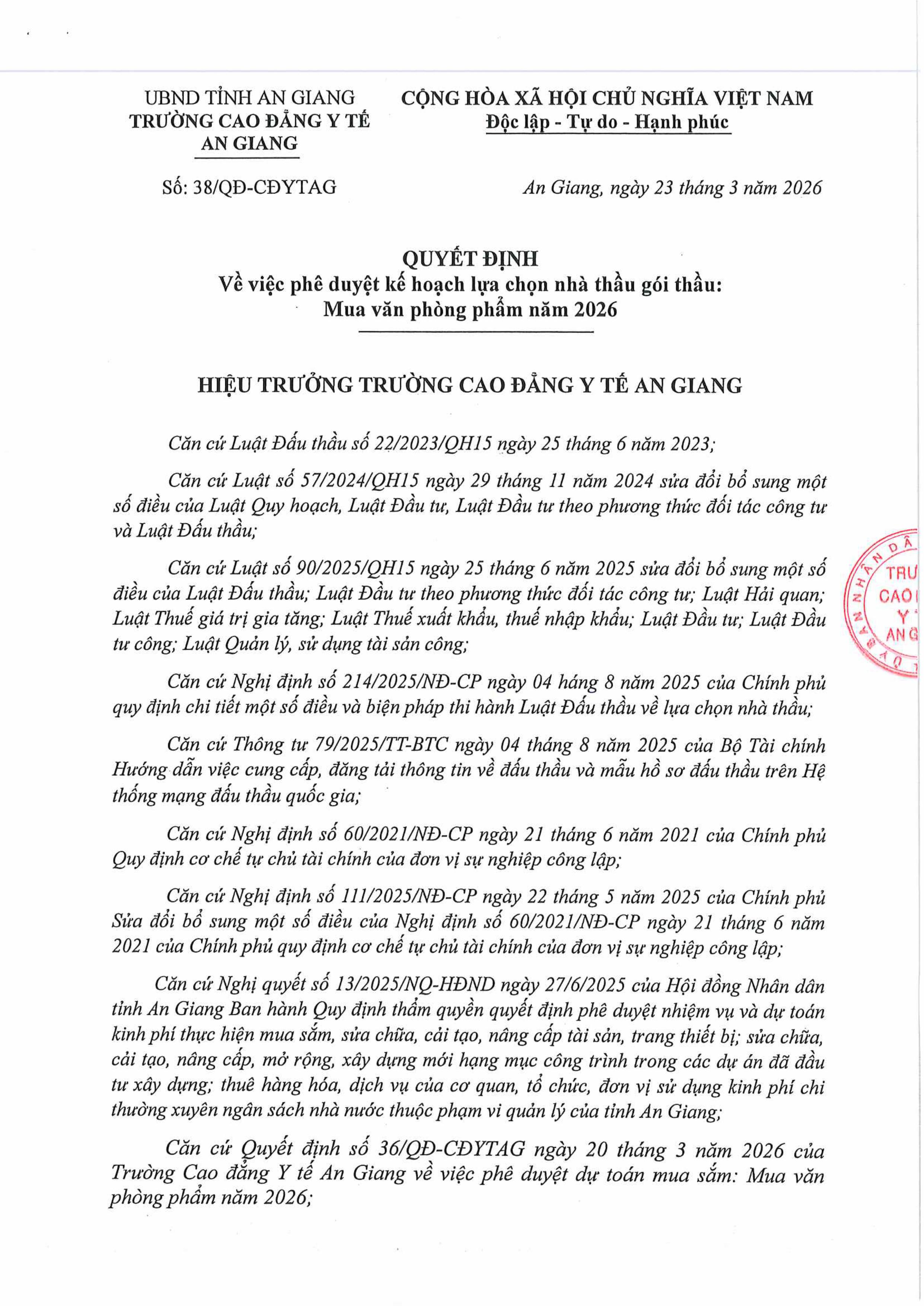 QUYẾT ĐỊNH Về việc phê duyệt kế hoạch lựa chọn nhà thầu gói thầu: Mua văn phòng phẩm năm 2026 08:25 24/03/2026 | 1098 lượt xemChia sẻ:Bài viết mới nhất Thông báo tuyển sinh hệ cao đẳng chính quy năm 2026 của Trường Cao đẳng Y tế An Giang QUYẾT ĐỊNH Về việc Phê duyệt kết quả chỉ định thầu gói thầu: Cải tạo sửa chữa cổng chính, nhà bảo vệ, nhà thuốc thực hành QUYẾT ĐỊNH Về việc phê duyệt kế hoạch lựa chọn nhà thầu gói thầu: Cải tạo sửa chữa cổng chính, nhà bảo vệ, nhà thuốc thực hành Kế hoạch tuyển sinh năm 2026 TRƯỜNG CAO ĐẲNG Y TẾ AN GIANG