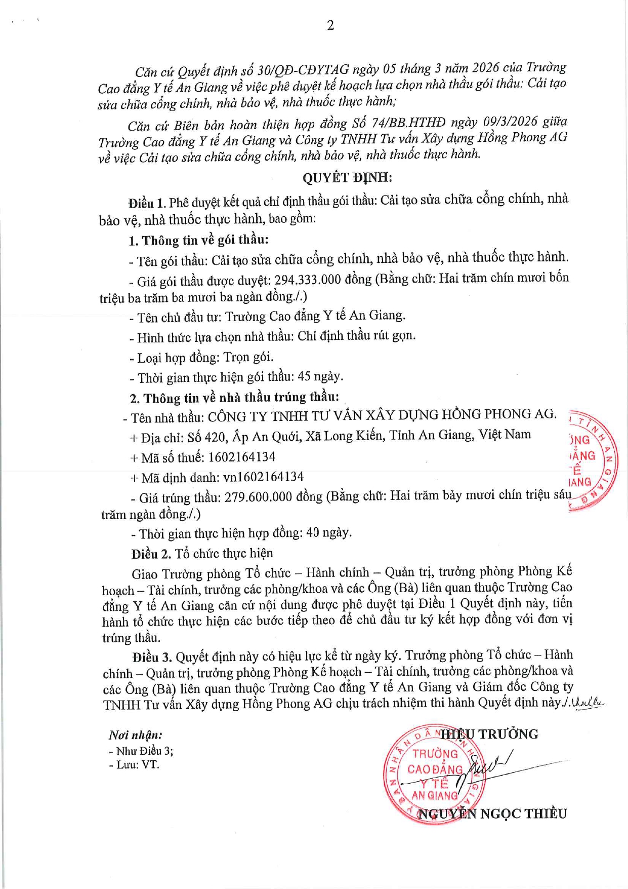02963852103QUYẾT ĐỊNH Về việc Phê duyệt kết quả chỉ định thầu gói thầu: Cải tạo sửa chữa cổng chính, nhà bảo vệ, nhà thuốc thực hành