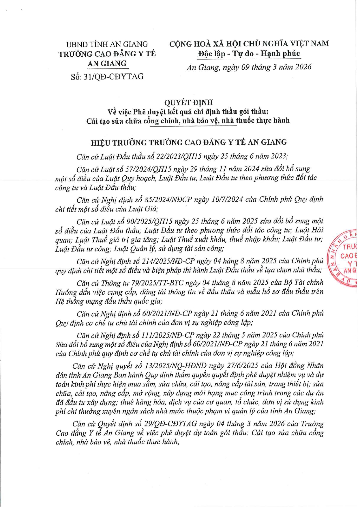 02963852103QUYẾT ĐỊNH Về việc Phê duyệt kết quả chỉ định thầu gói thầu: Cải tạo sửa chữa cổng chính, nhà bảo vệ, nhà thuốc thực hành