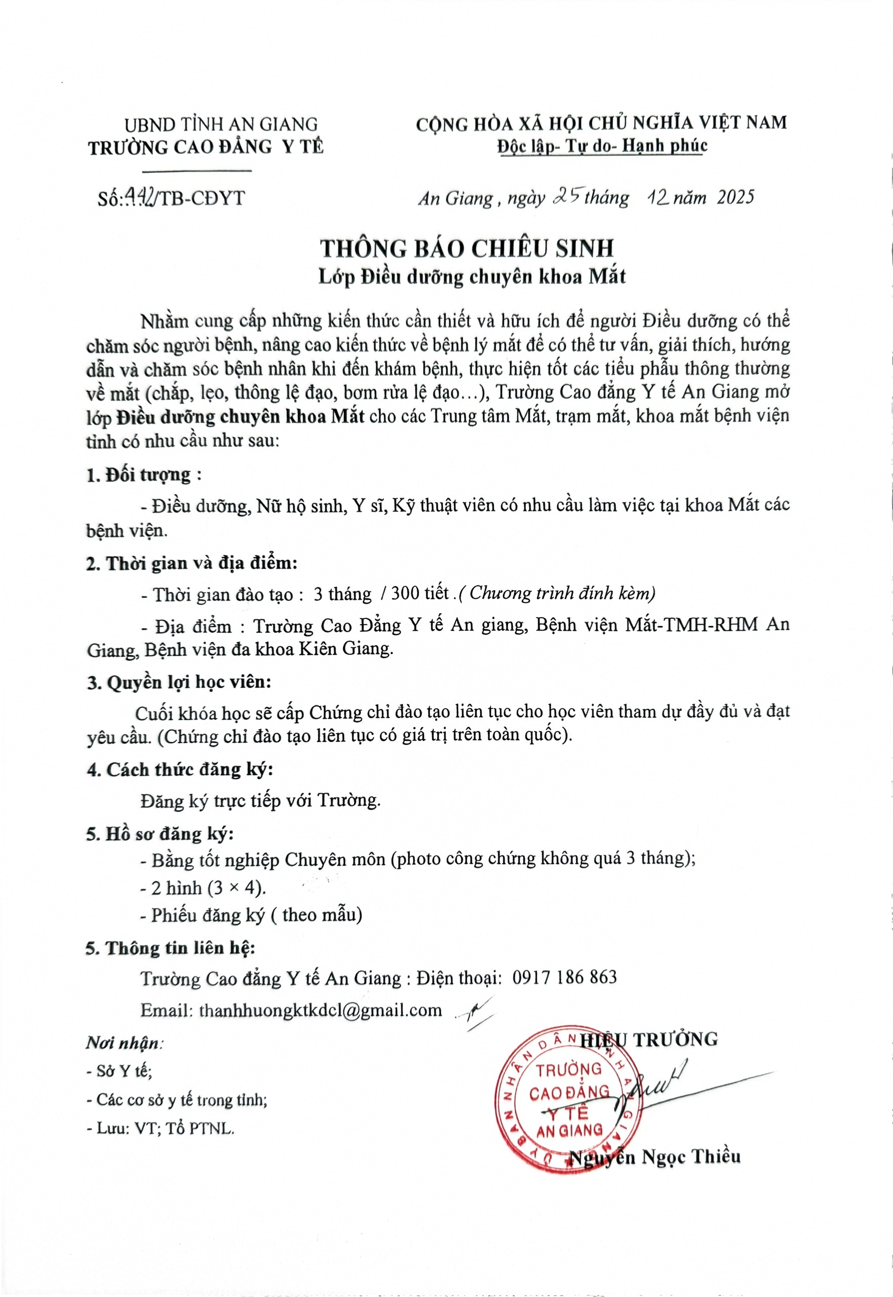 Thông báo chiêu sinh lớp Điều dưỡng chuyên khoa mắt 16:38 26/12/2025 | 14 lượt xemChia sẻ:Bài viết mới nhất Kế hoạch mở các lớp đào tạo liên tục, đào tạo thường xuyên, sơ cấp Lịch thi học kỳ, Danh sách thi lại, học lại Quyết định Về việc phê duyệt kế hoạch lựa chọn nhà thầu gói thầu: Cải tạo nâng nền nhà xe sinh viên và sân cầu lông Quyết định Về việc Phê duyệt kết quả chỉ định thầu gói thầu: Cải tạo nâng nền nhà xe sinh viên và sân cầu lông Quyết định phê duyệt kết quả chỉ định thầu gói thầu giảng dạy giáo dục quốc phòng và an ninh NH 2025 – 2026